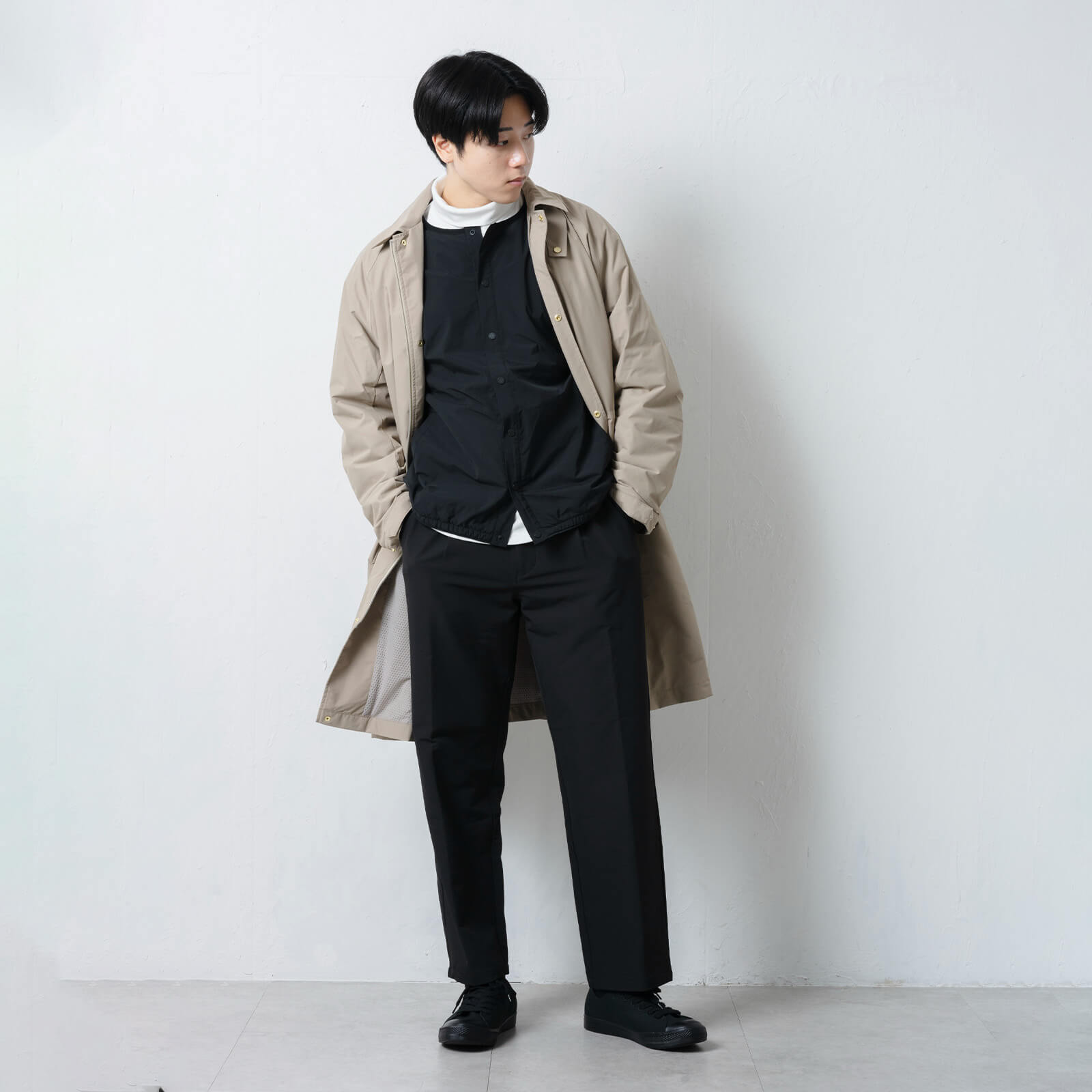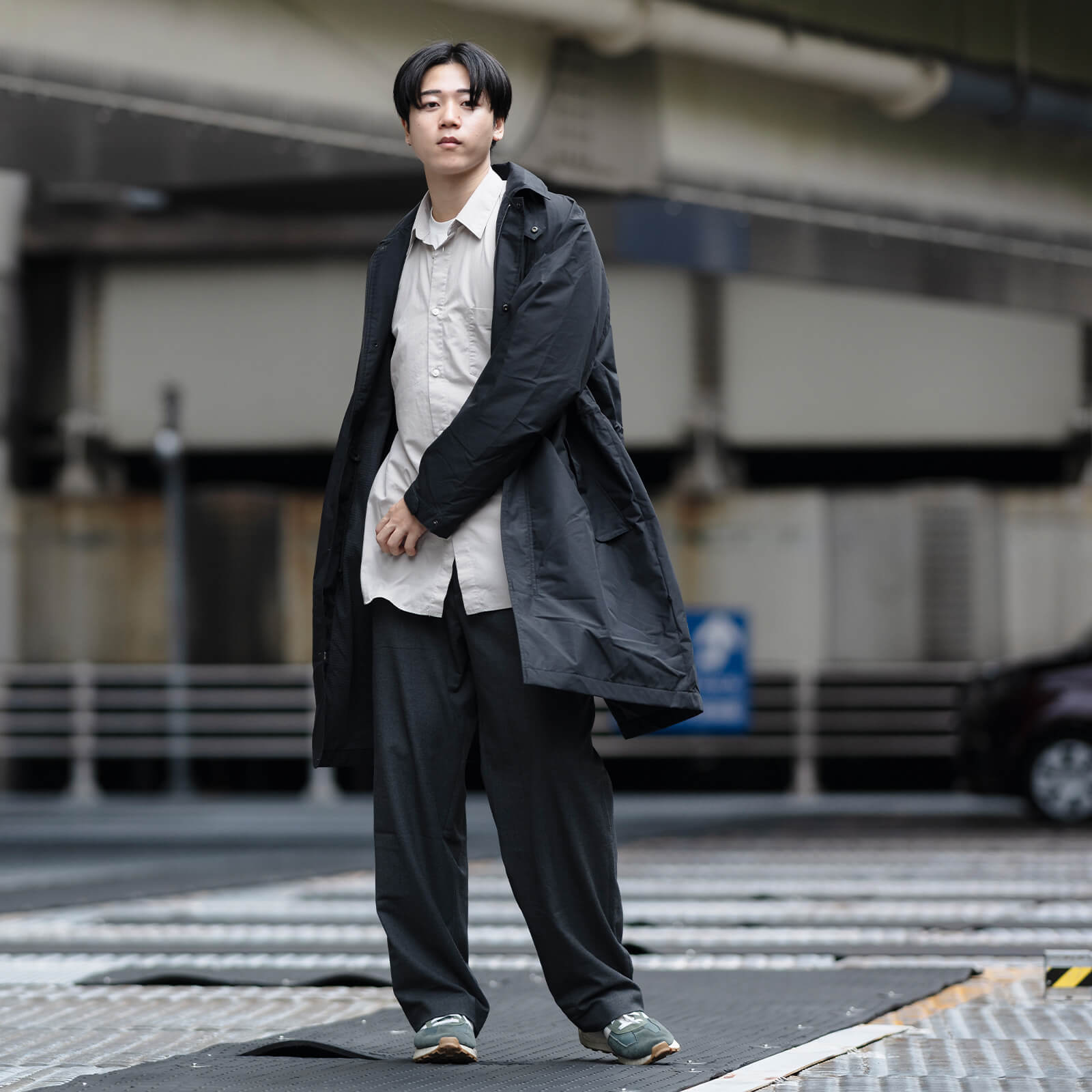 ラグランスリーブとゆったりとしたシルエットで、リラックスした雰囲気を出し、ステンカラーコートのカッチリとした印象を和らげました。