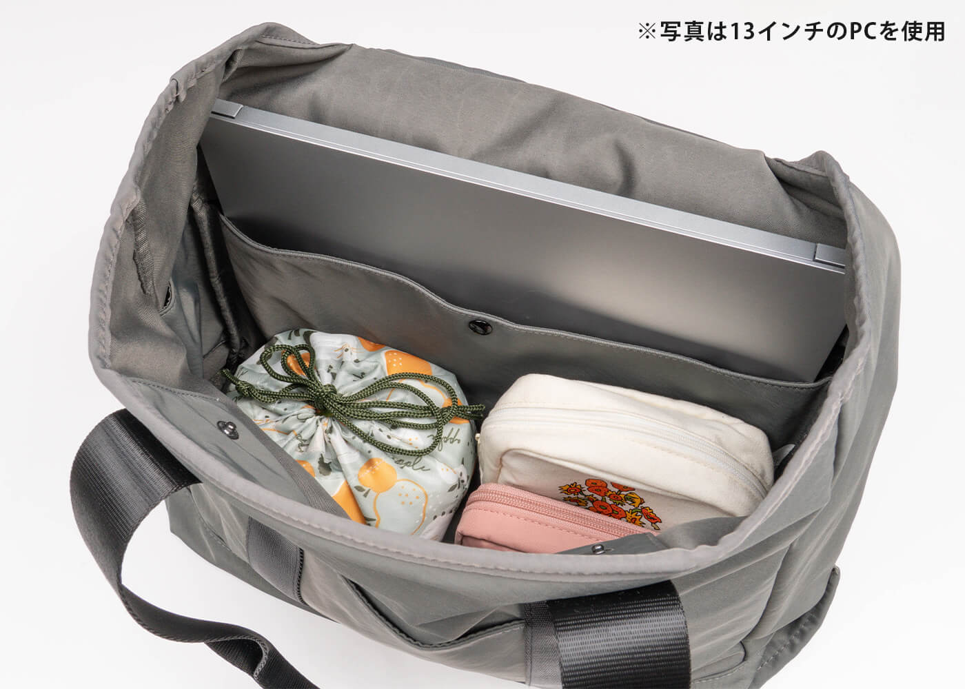 一回り小さい13インチのノートPCであれば内側の大きな横長ポケットにも収納できるので、他の荷物と分けて整理できます。