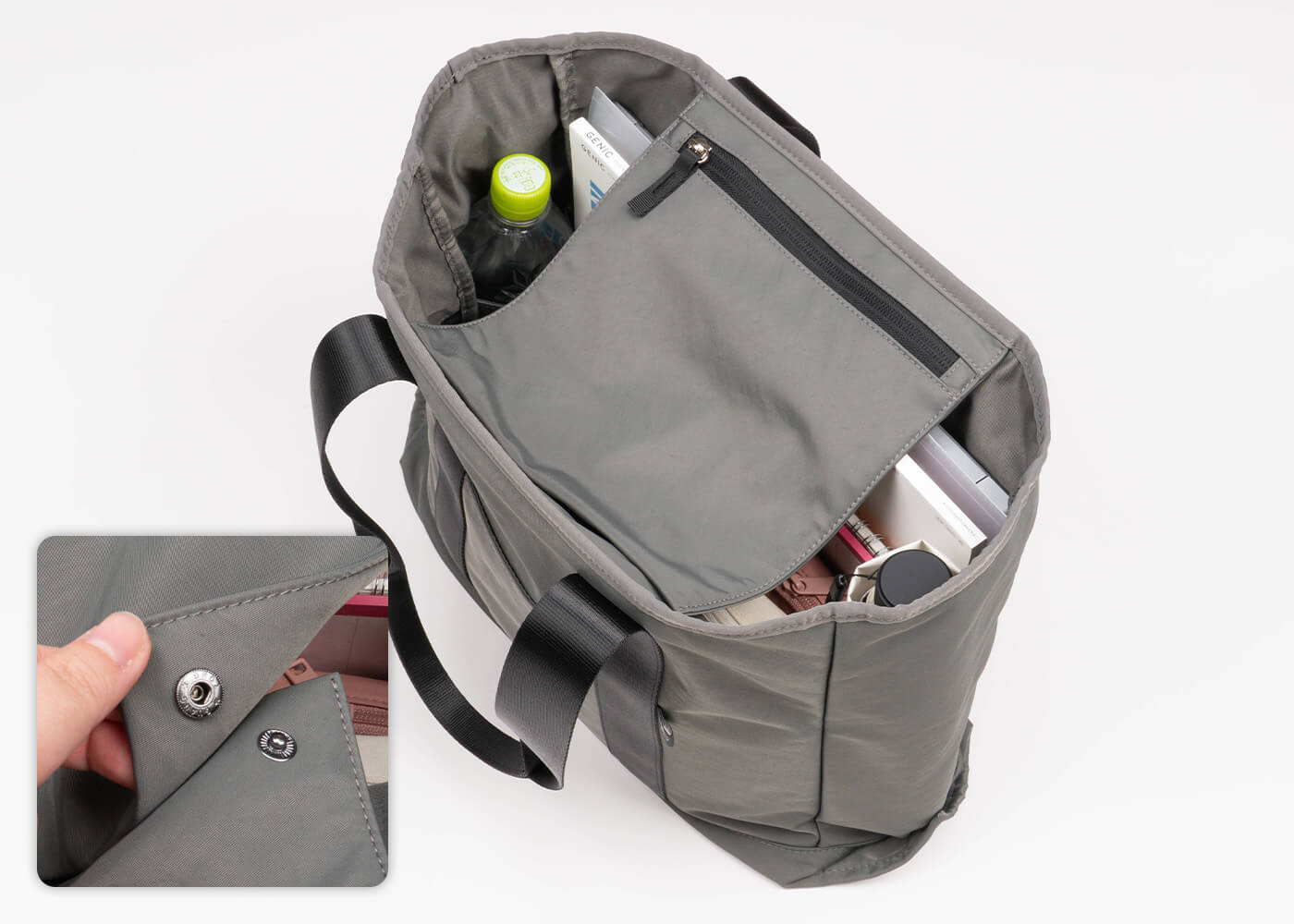 内側に配置された吊り下げタイプのポケットは、スナップボタンで反対側に固定することができます。