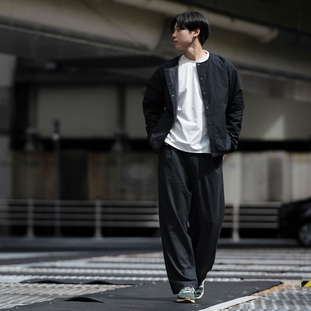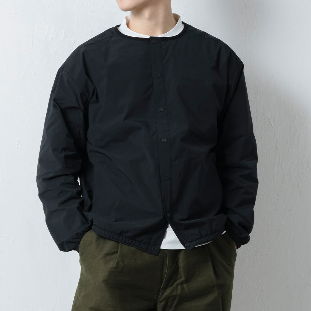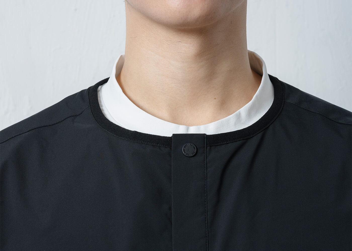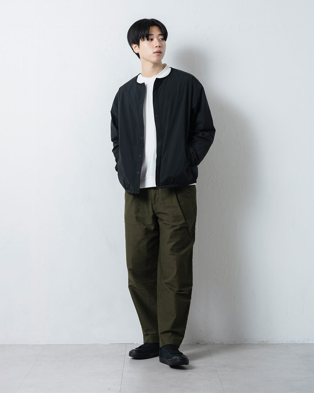 ミニマルで洗練された印象のノーカラーデザイン。適度なハリ感のある素材が、カジュアルさの中にスマートな雰囲気を加えます。