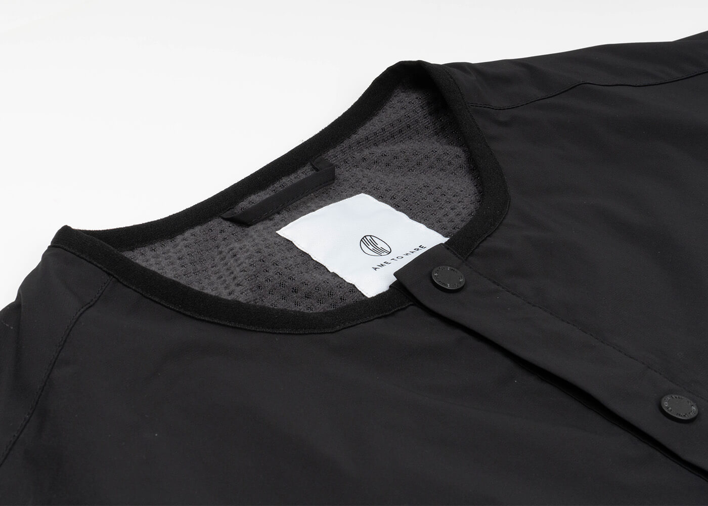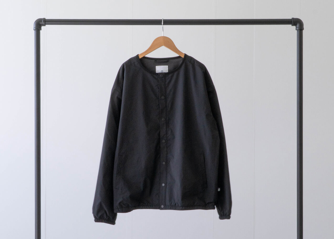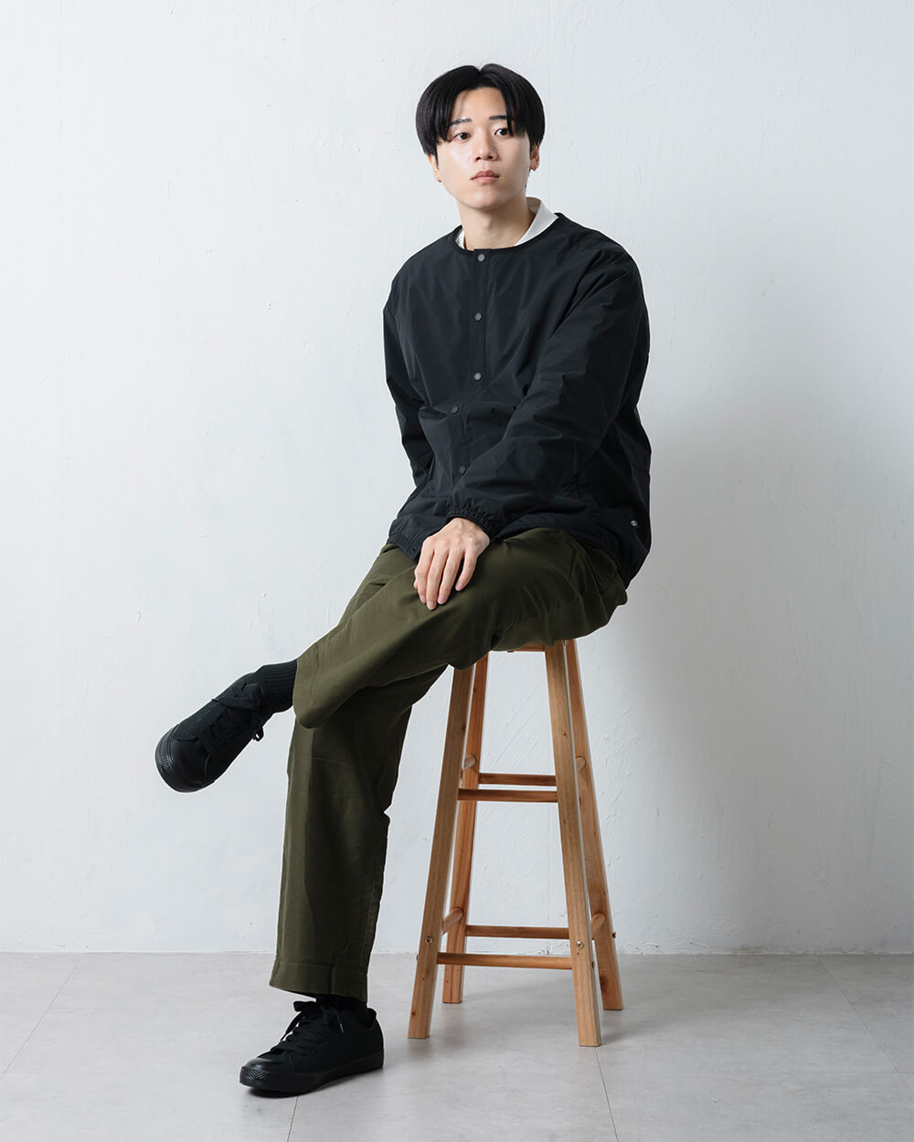 ミニマルで洗練された印象のノーカラーデザイン。適度なハリ感のある素材が、カジュアルさの中にスマートな雰囲気を加えます。