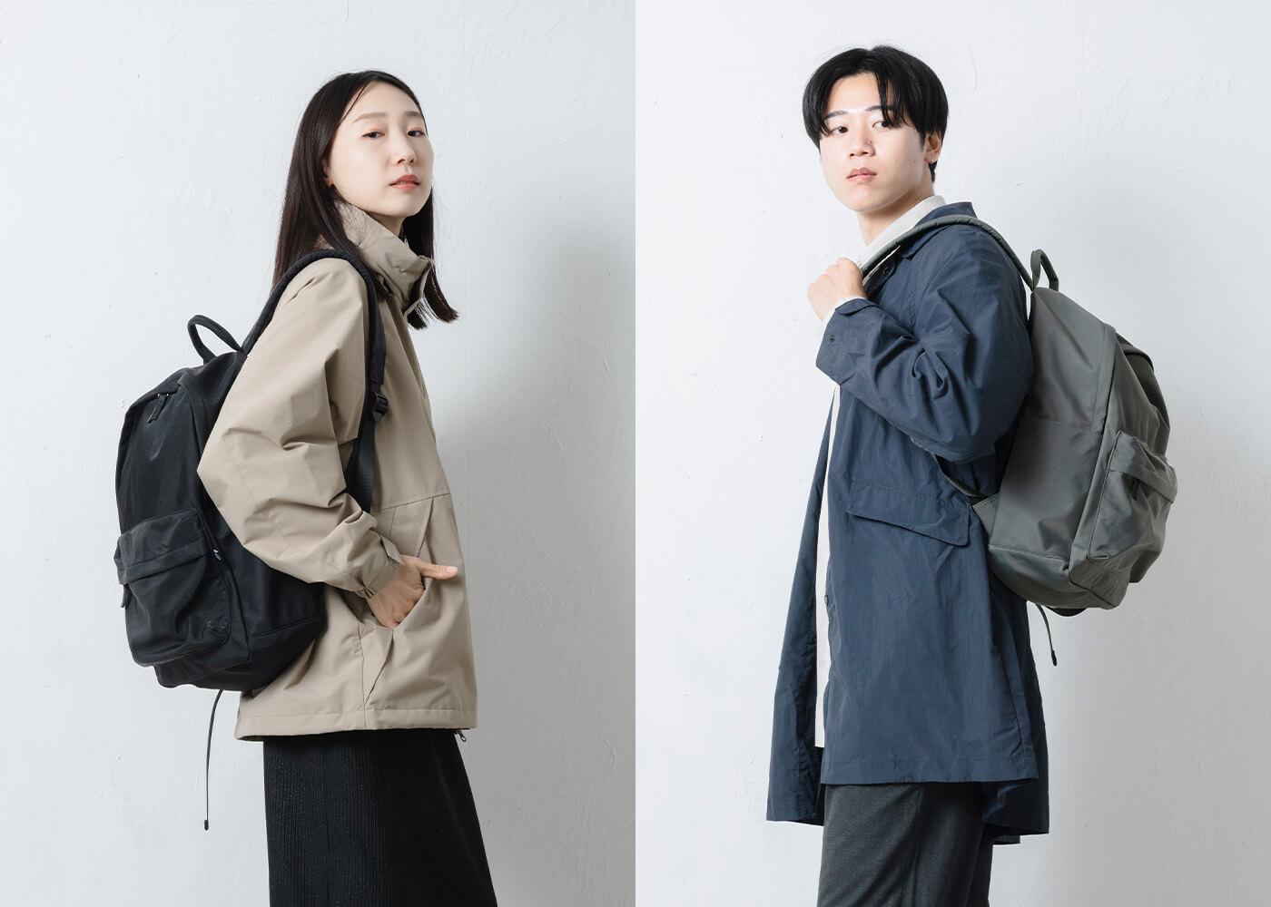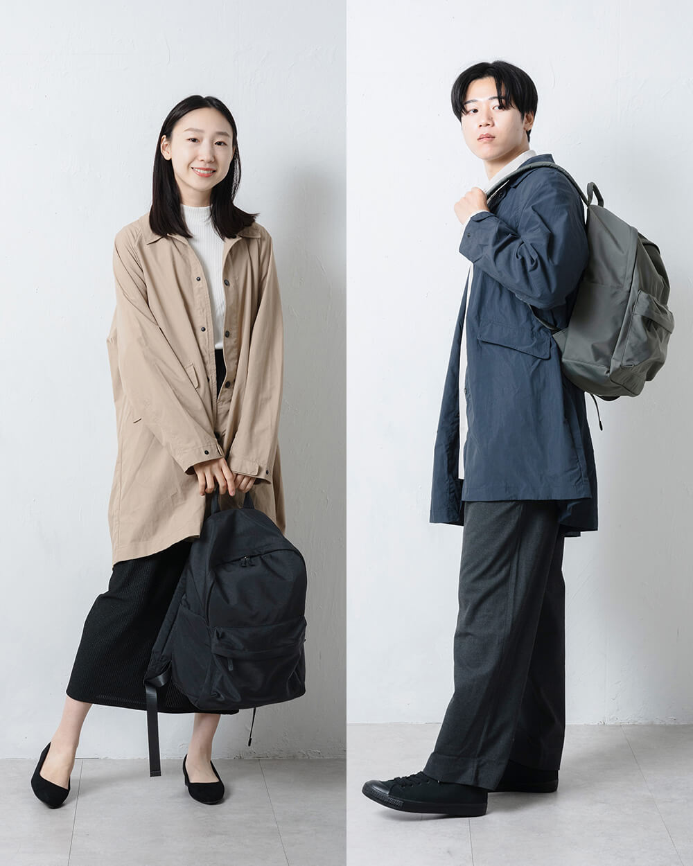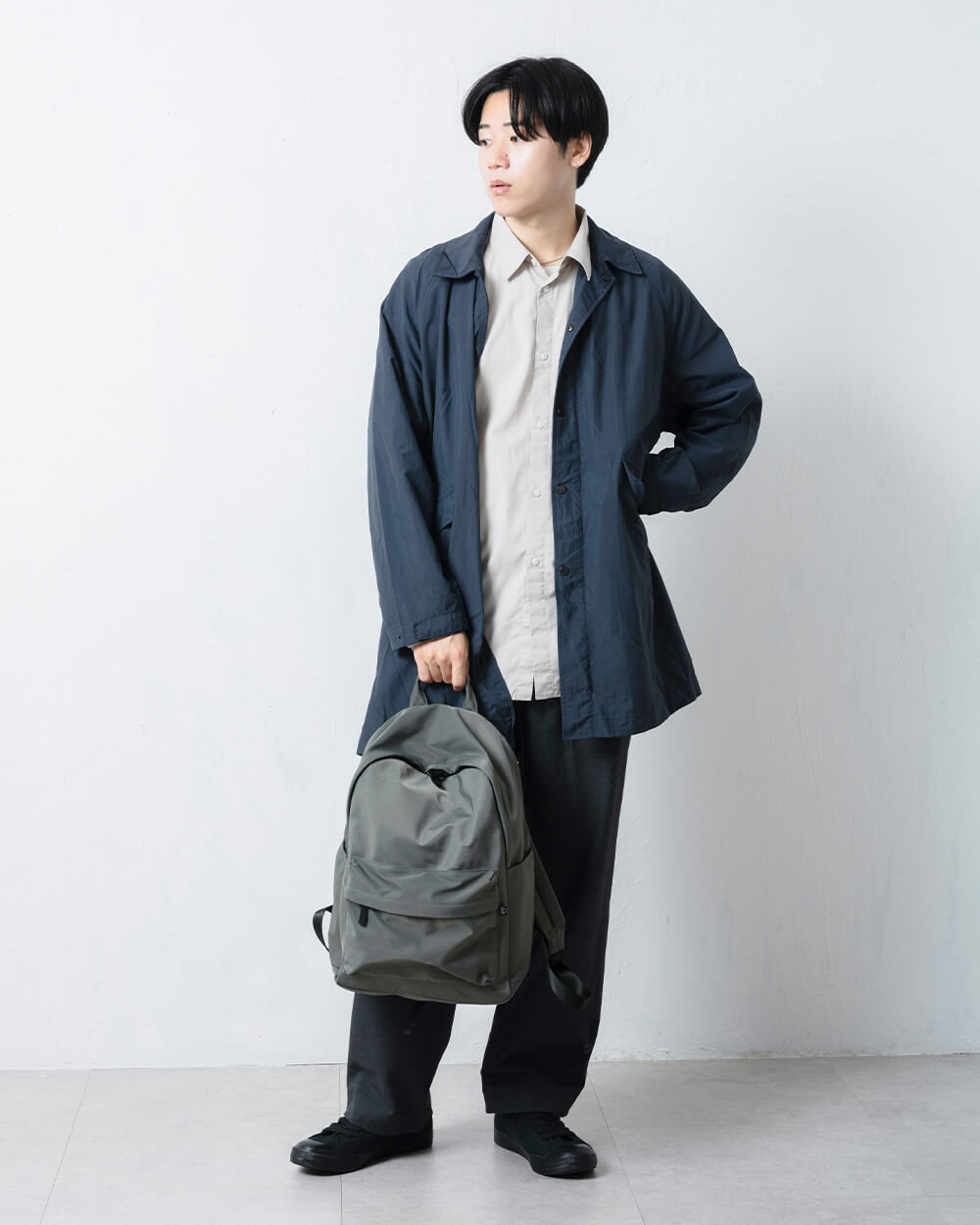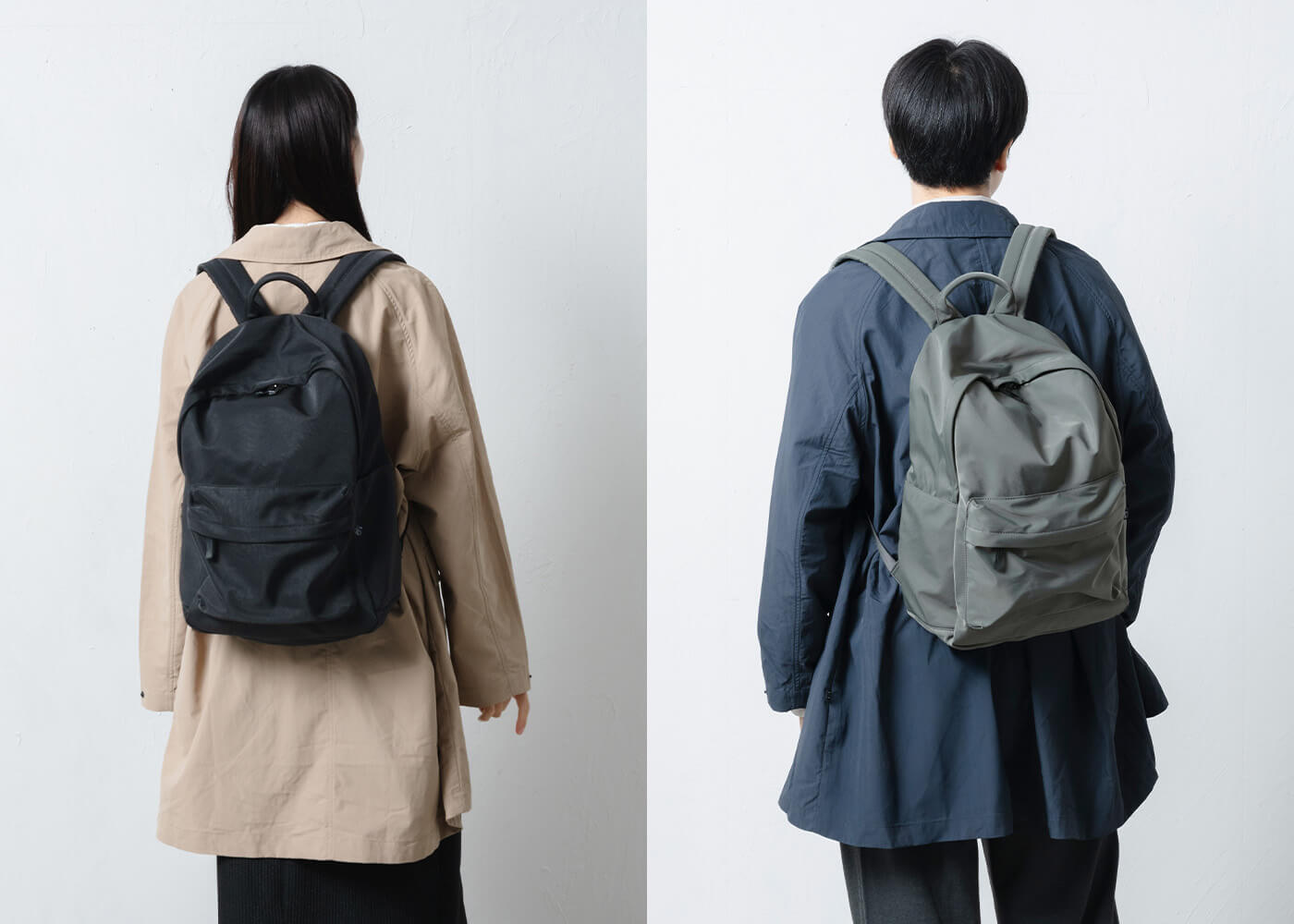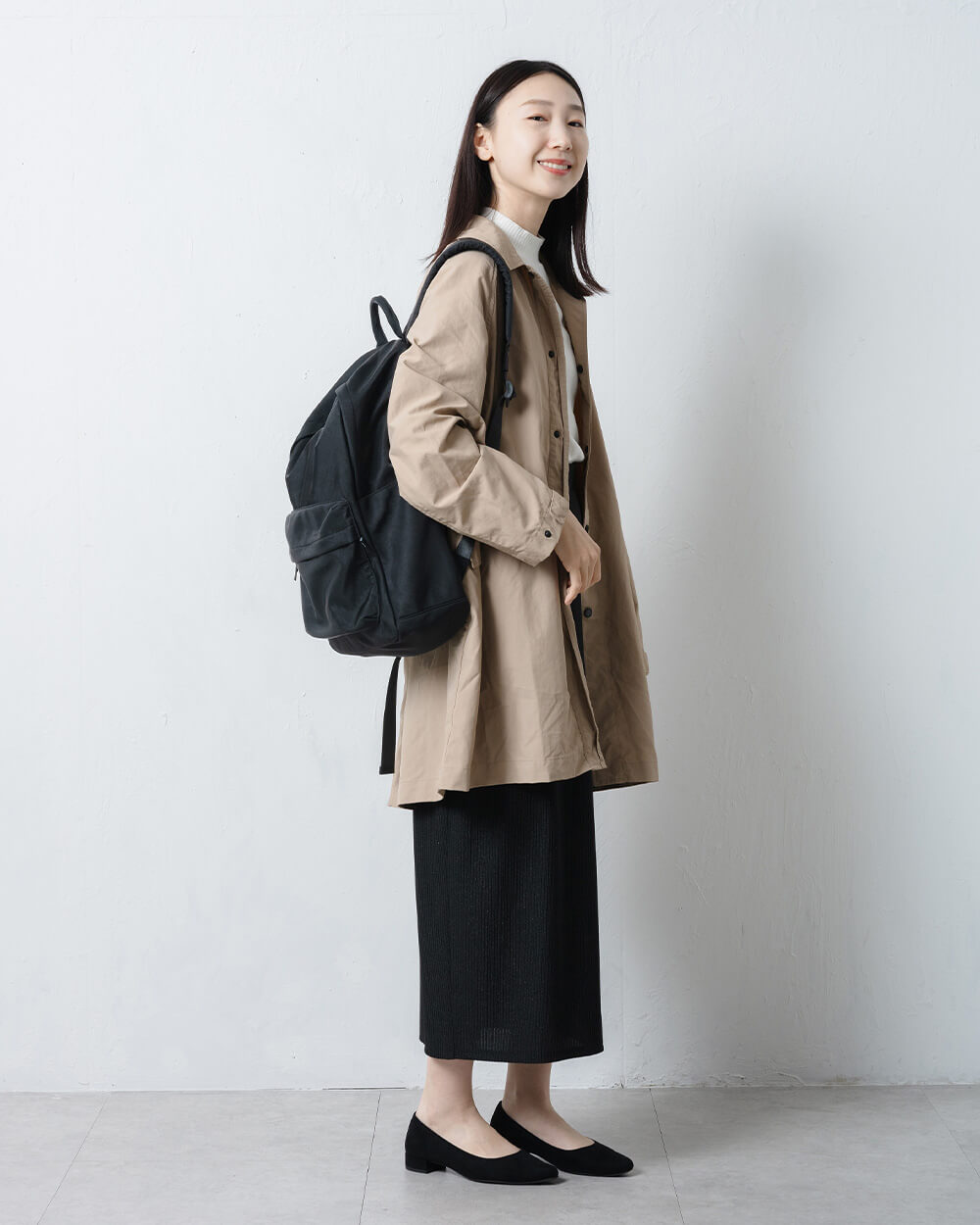 カジュアルになりやすいリュックですが、マットで上品な質感が大人の装いにもよく馴染みます。