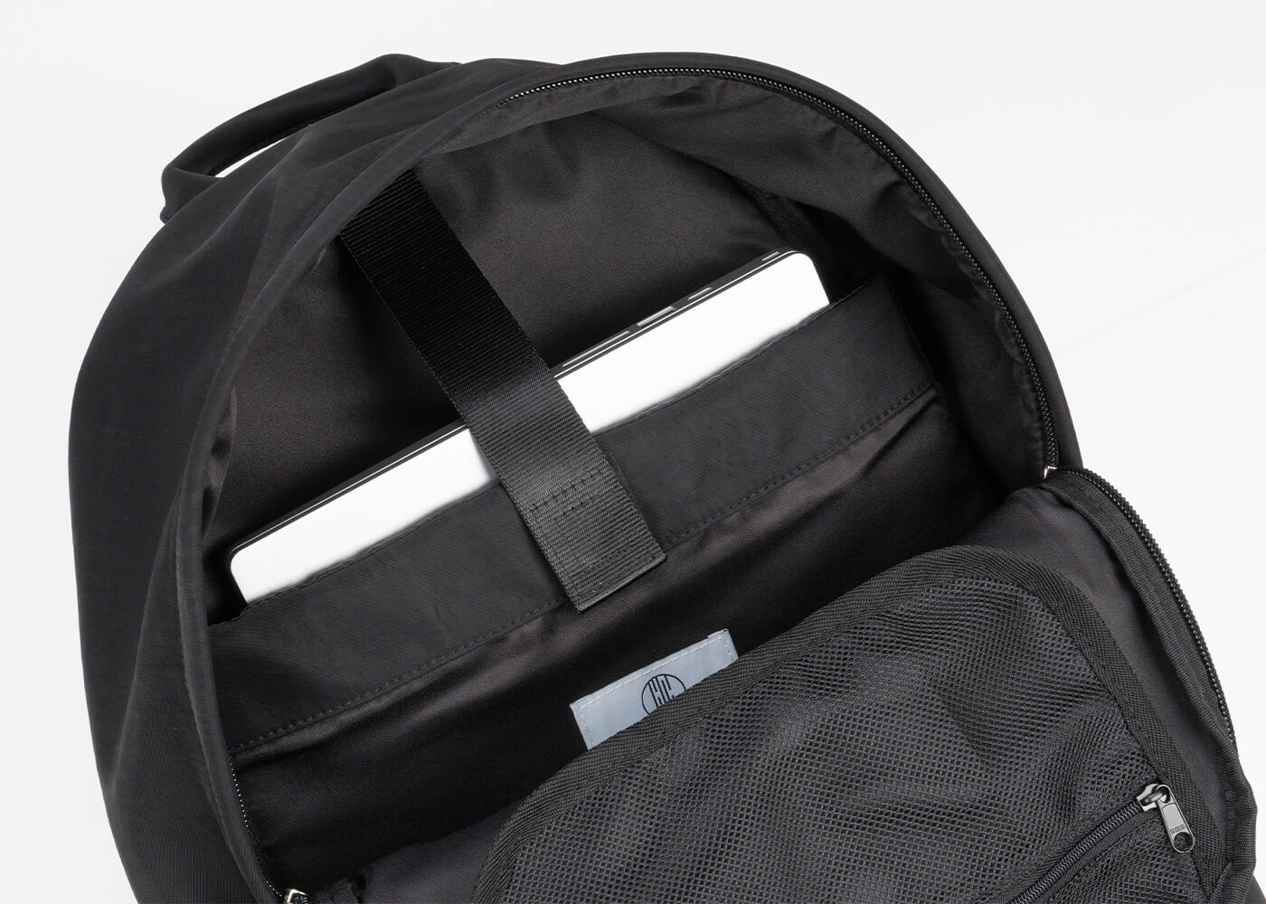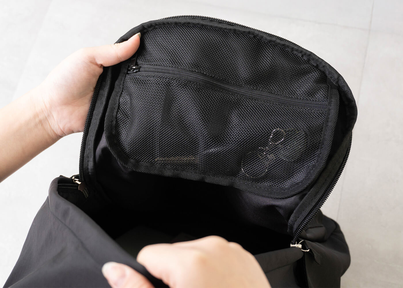 メイン収納上部のファスナー付きメッシュポケットは、中身が見えるから便利。家の鍵やリップ、目薬など、すぐ使いたいものを定位置に。探す時間を減らします。