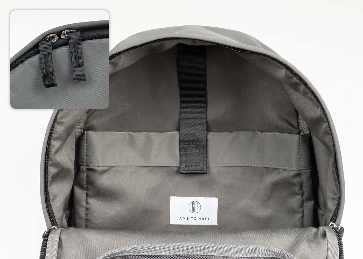外側のファスナーポケットのそばにAME TO HAREのブランドタグを配置。