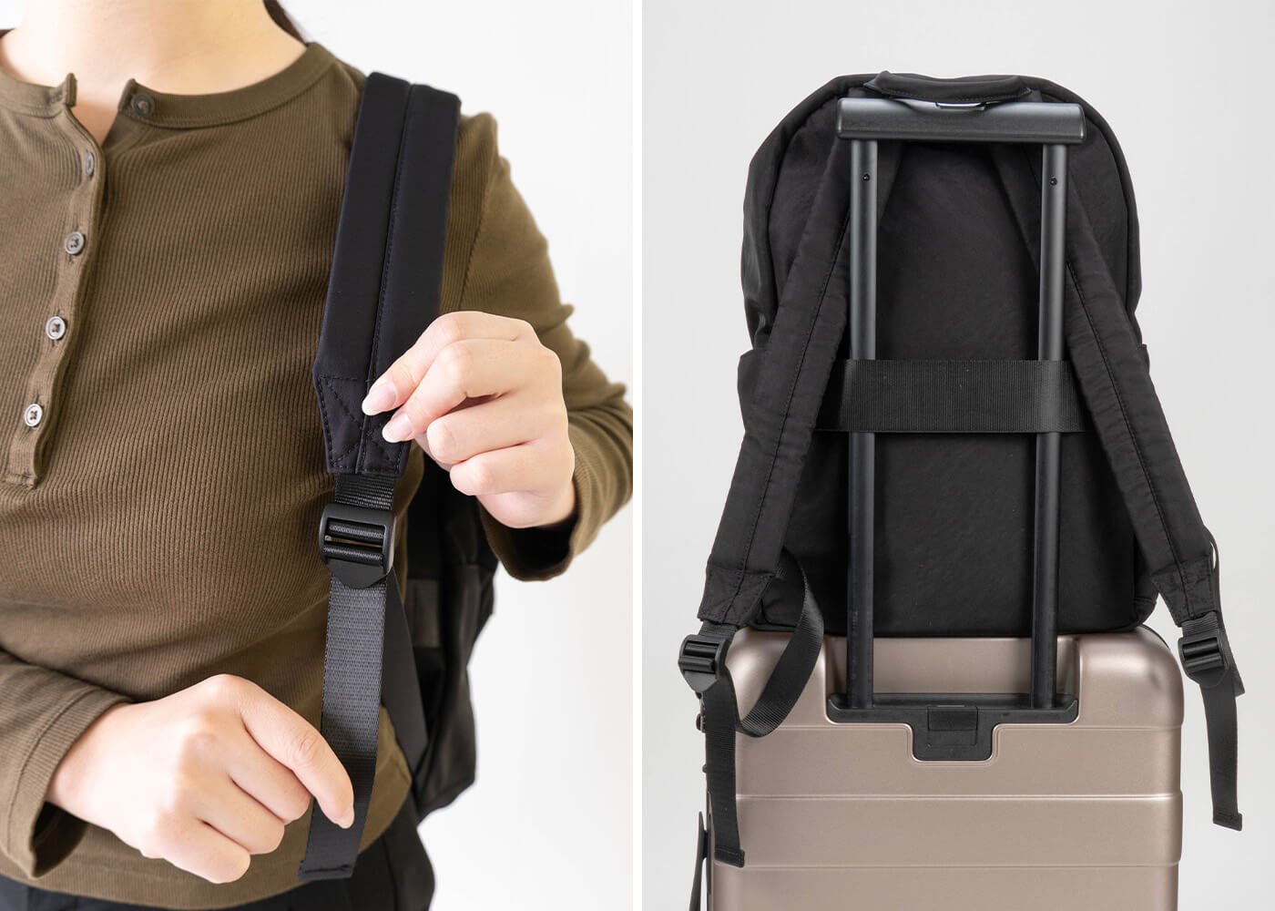 背面にはベルトがついているので、スーツケースの取っ手に固定することができます。