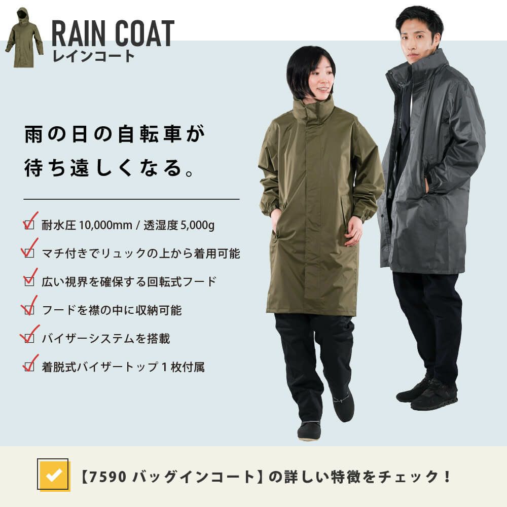 男女兼用レインコート防水・快適・美シルエットの究極レインコート。フード取り外し可能/バイザートップ&収納袋付き。¥7,980(税込)◎