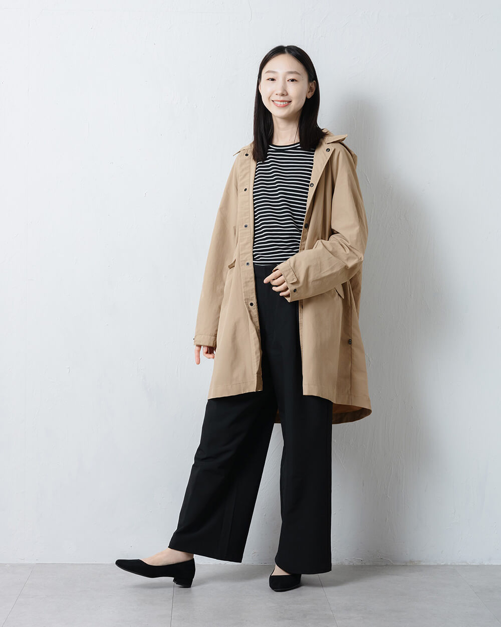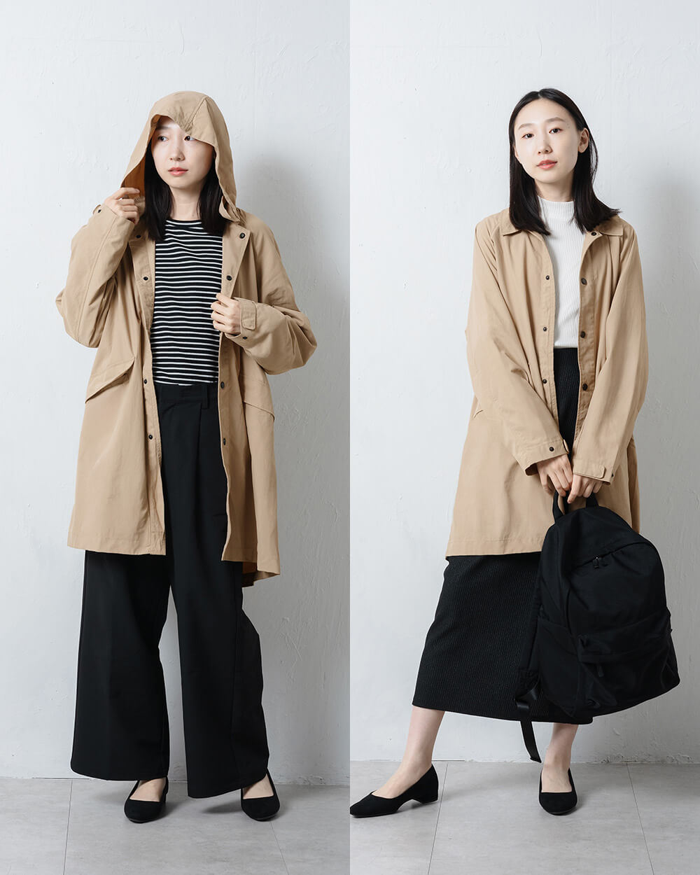 フードは簡単に取り外しができ、フード付きのカジュアルなスタイルと、首元がすっきりとしたステンカラーコートのスタイルを、 その日の気分で使い分けられます。