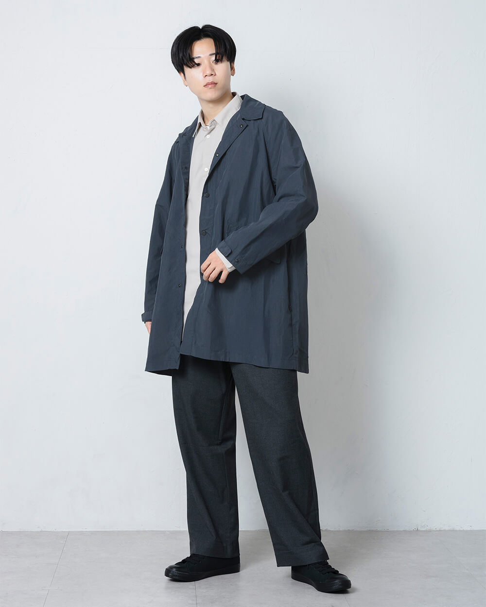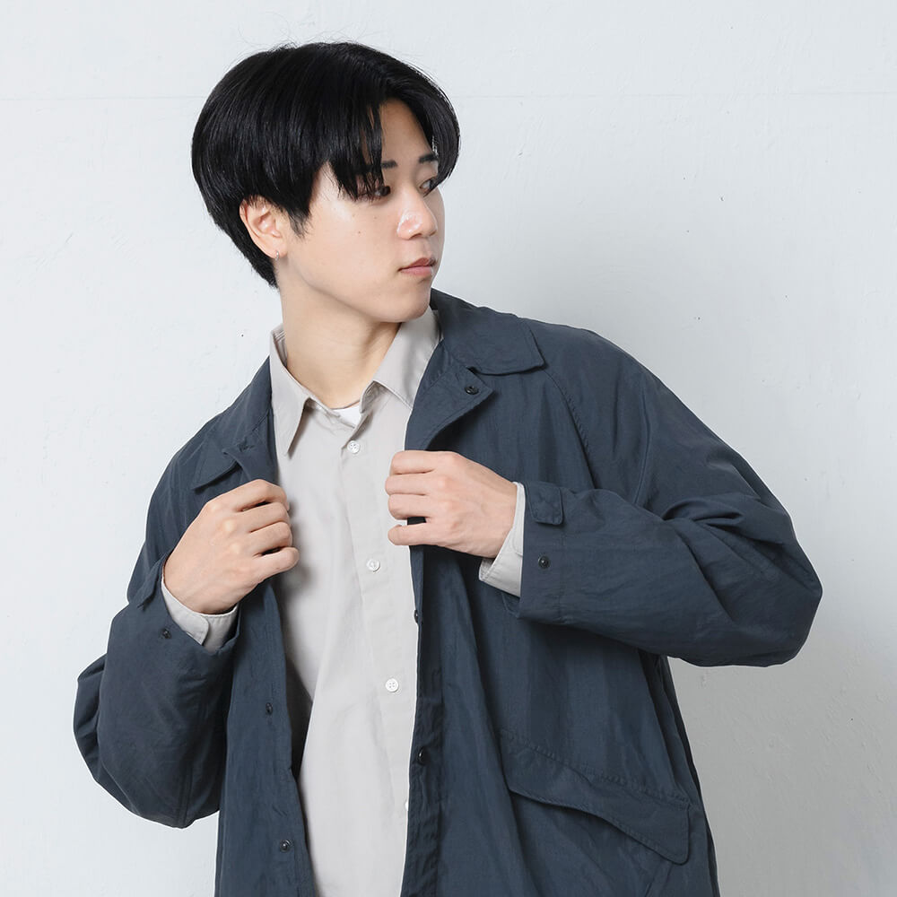 軽量なナイロンタッサー素材によるコットンのような自然なシワ感と、ゆとりのあるシルエットが魅力。