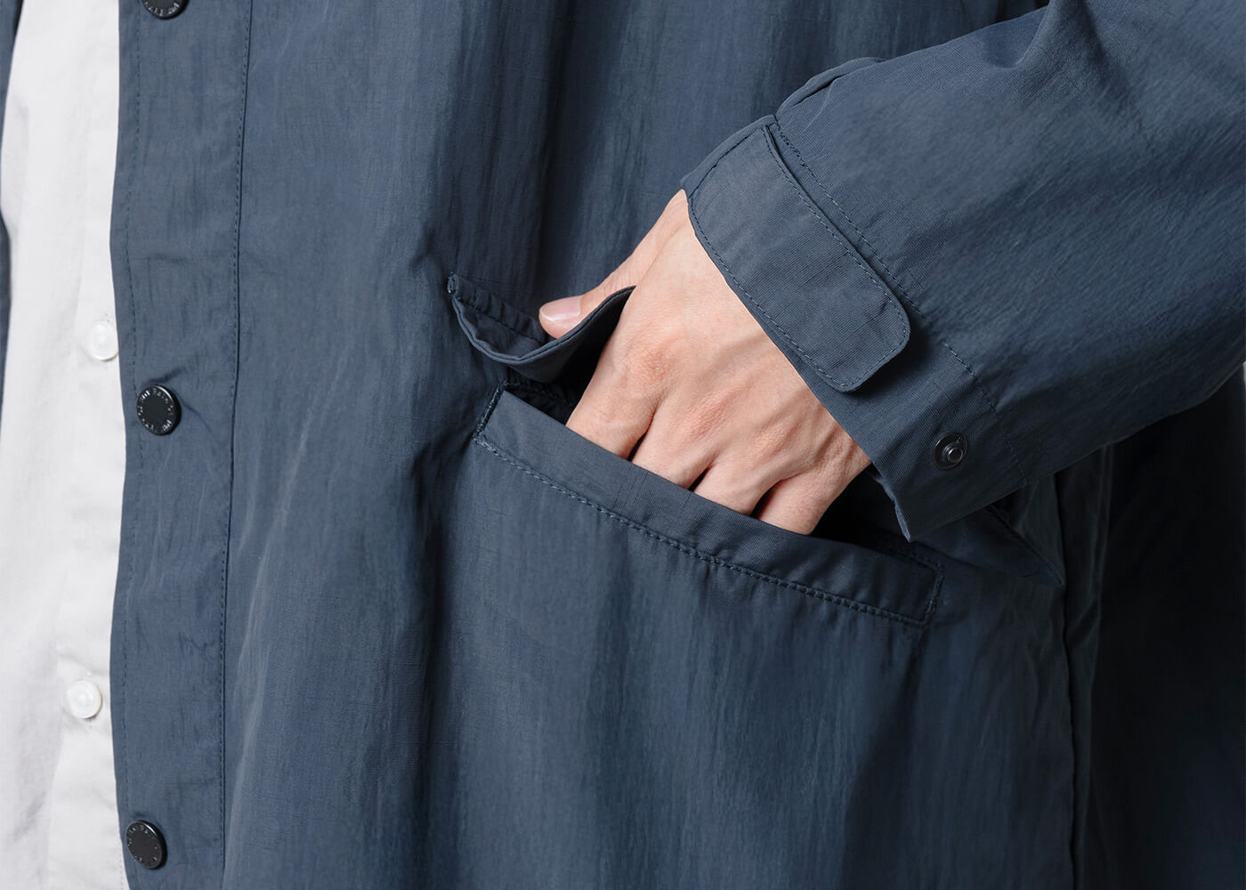 フロントは、雨風の侵入を防ぐ二重の前立て仕様。さらに内側の前立てを外側に折り返す構造で、ボタンの隙間から水が入り込むのを防ぎます。