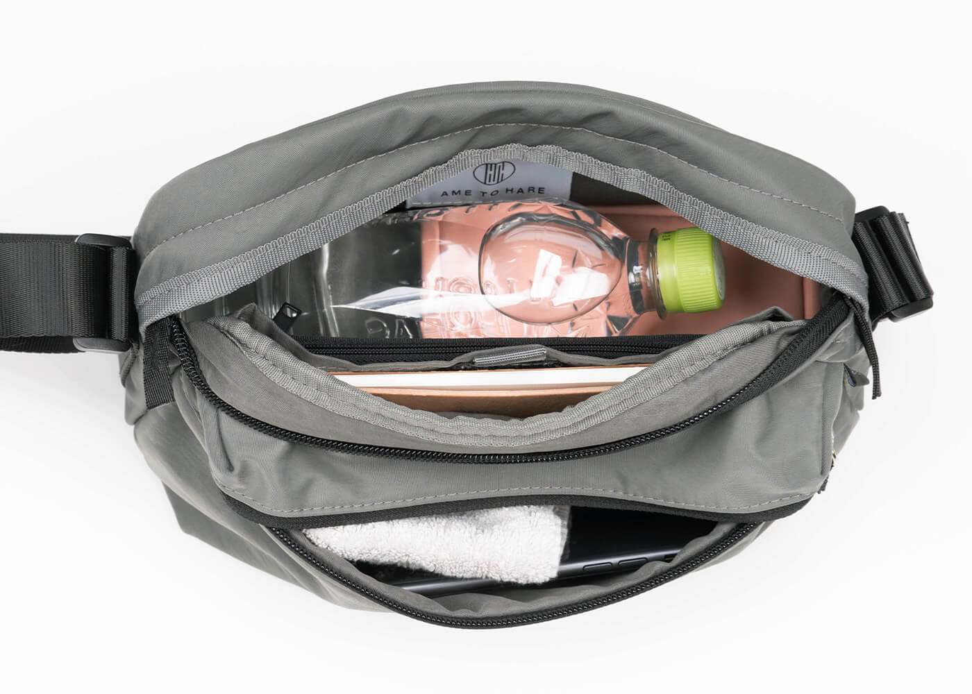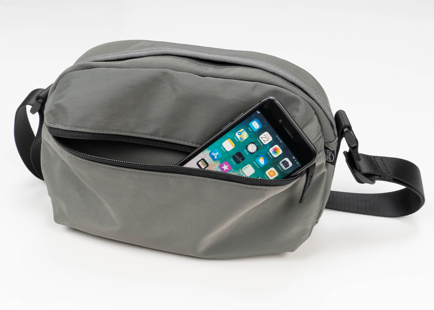 見た目以上の大きな収納力が最大の特長。スマホ、財布、鍵、イヤホンなど、休日に持ち歩く必需品がバッチリ収納できます。