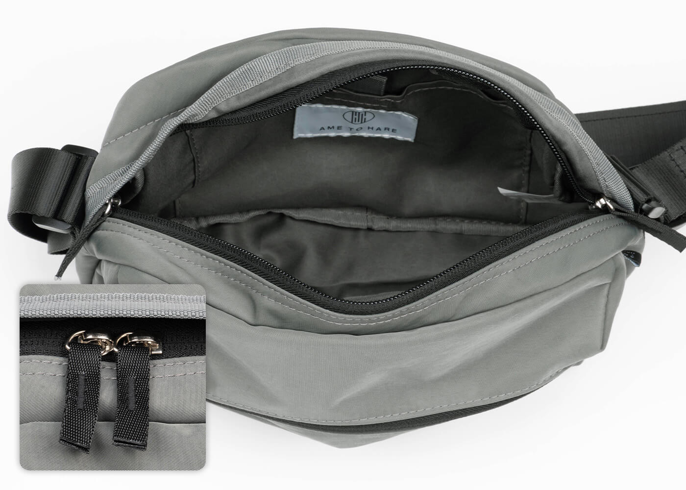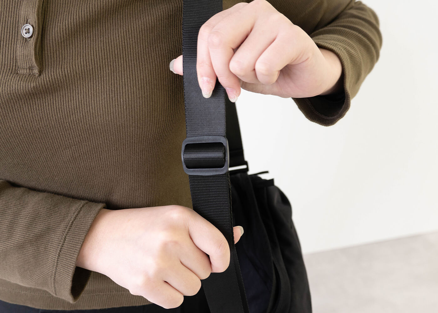 コンパクトながら荷物を入れた時の重さを考慮し、幅広のショルダーベルトを採用。