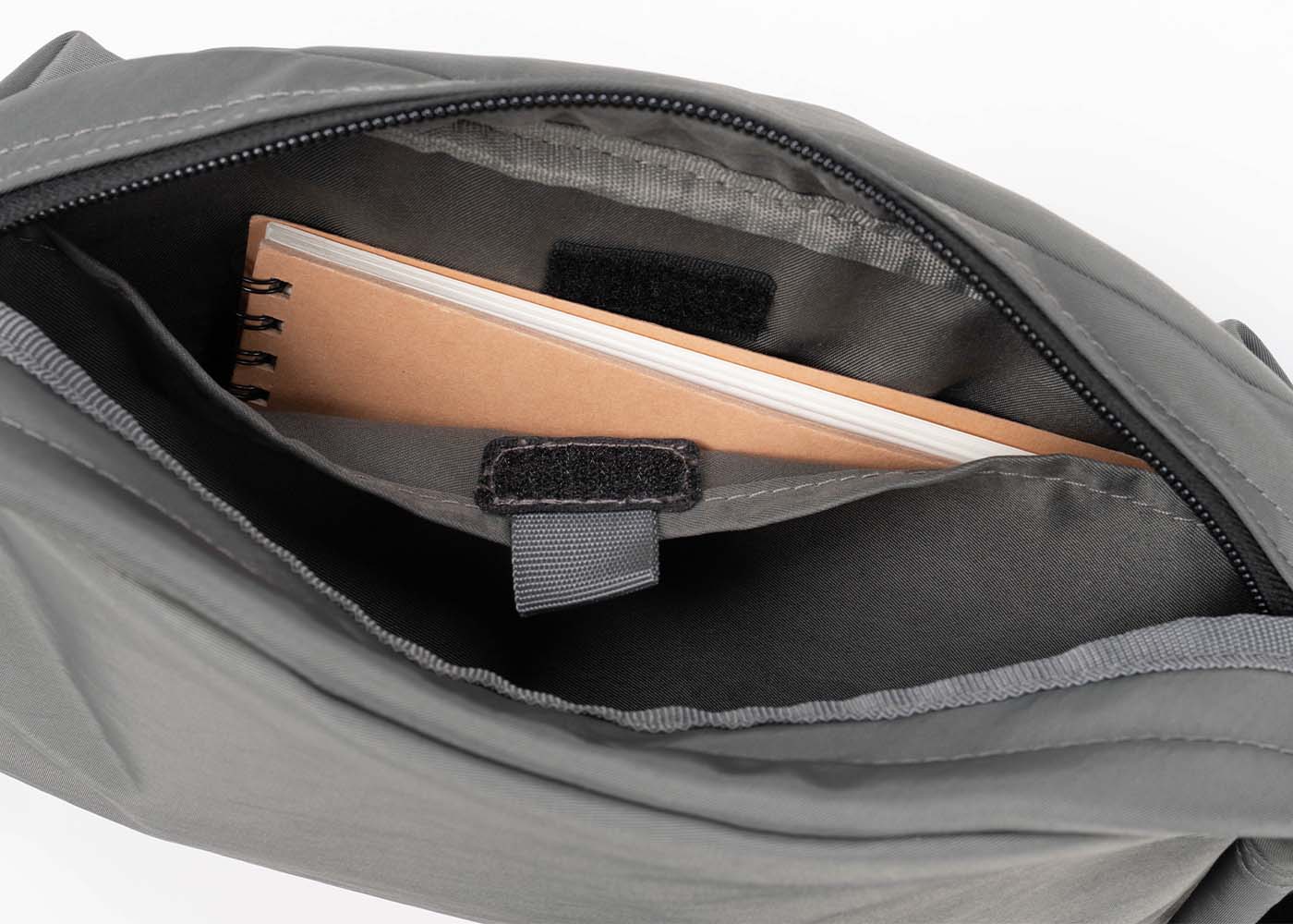 内側の仕切りポケットは、中身が飛び出しにくいようマジックテープで留まる仕様。