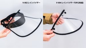 一方、V-004は固定バンドがなくバイザー部分のみのタイプであり、対応するフードにスナップボタンで取り付けられます。当社の対応レインウェアを使っており、雨の日しか使わない方、バンドに違和感のある方、ヘアスタイルを乱したくない方などはこちらの方が使いやすいでしょう。
