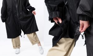 ロングコートの難点のひとつが、脚さばきの悪さです。しかし、それを解決しようとサイドスリットを入れると、雨風で下半身が濡れてしまうことがあります。